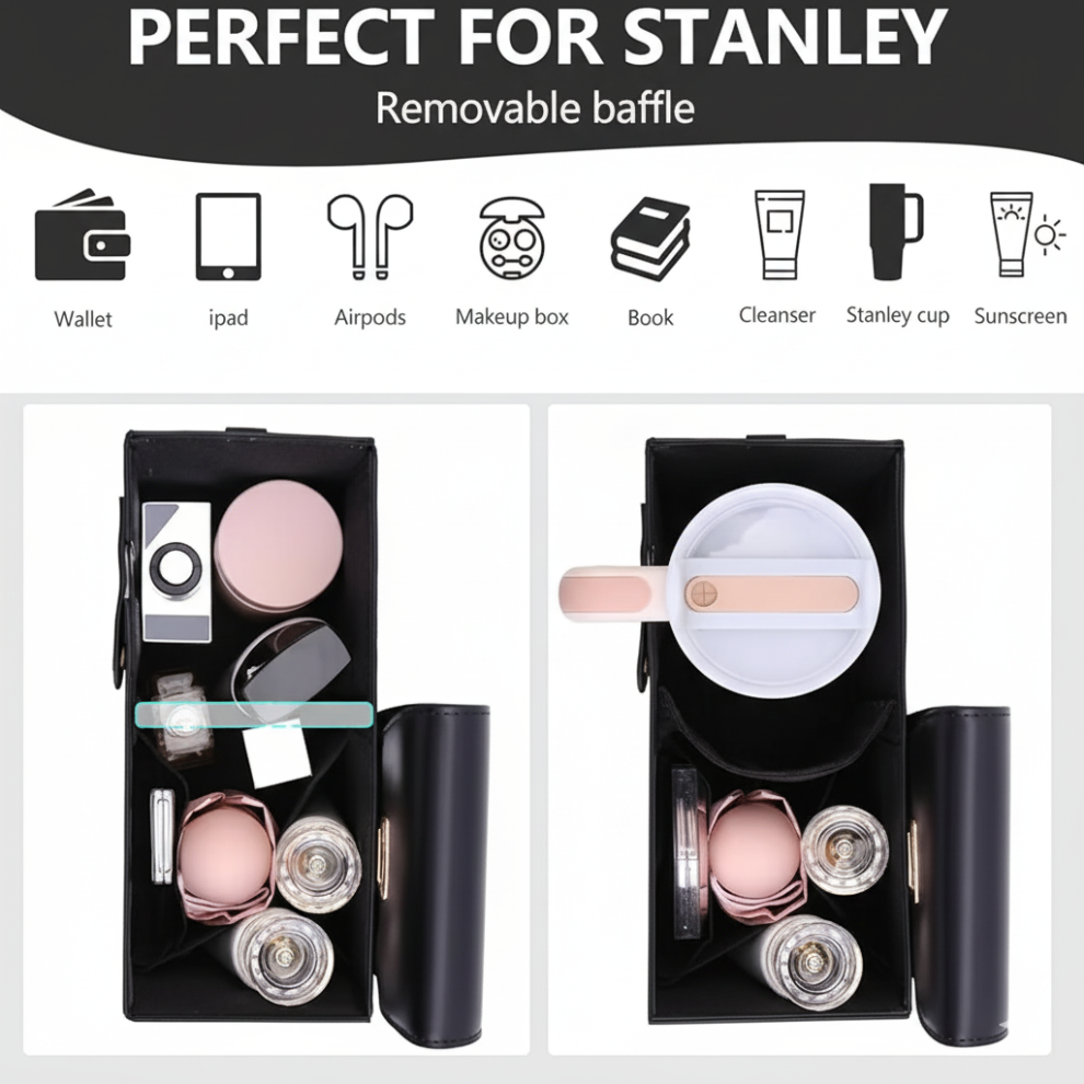 Designed with a removable baffle, this smart bag easily adjusts to hold your Stanley cup or daily essentials like your wallet, iPad, AirPods, makeup box, and sunscreen. Keep everything organized and accessible in one sleek, stylish tote — ideal for busy days, travel, or work on the go.